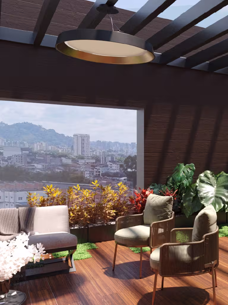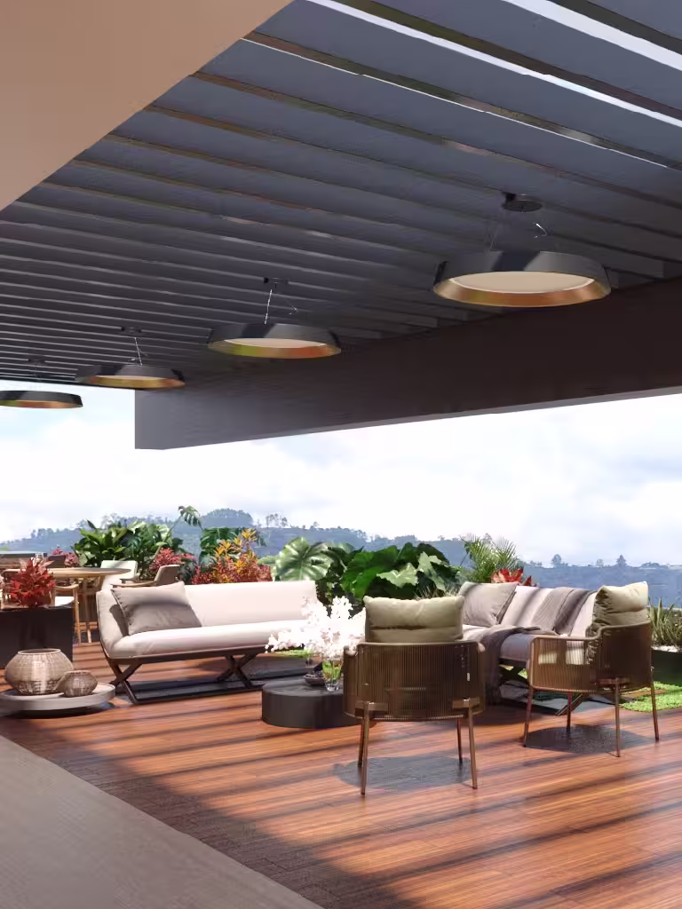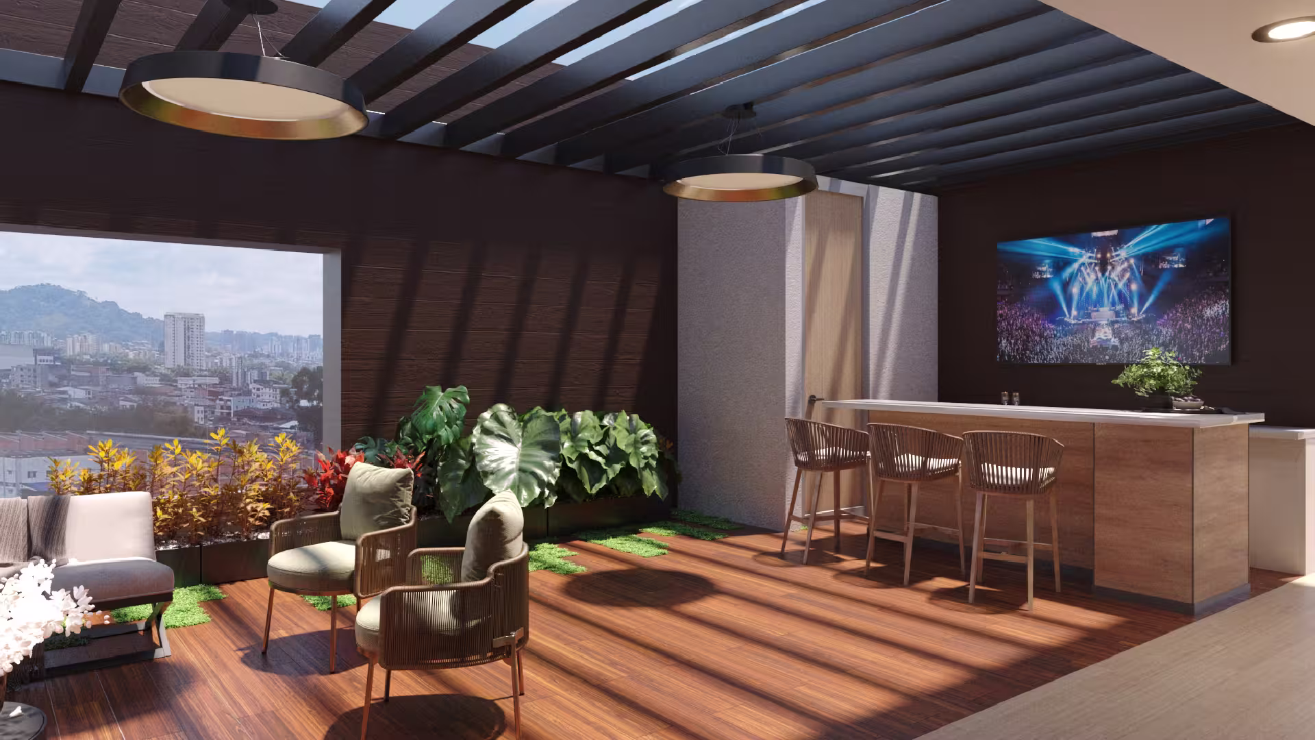 Las imágenes son una representación artística aproximada del diseño, los acabados, texturas, dimensiones, formas, distribución, especificaciones y áreas del proyecto, son susceptibles a cambios por parte de la compañía constructora sin previo aviso. El mobiliario y los vehículos no hacen parte del proyecto. El urbanismo cerca al proyecto hace parte de una representación artística y aproximada que no compromete ninguna entidad pública o privada. El jardín y terraza que se encuentra frente al piso o nivel 1 del proyecto, es un área de cesión y tal área de cesión en un futuro podrá ser utilizada para la ampliación de la Av. Ferrocarril en Dosquebradas.